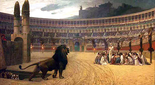 Kristna martyrer förbereder sig att dö inför publiken på Colosseum. Redan under antiken uttryckte flera romerska författare sin avsky för aktiviteterna på arenan. När sedan kristendomen blev statsreligion i Rom förbjöds alla "hedniska" skådespel på teatrar och amfiteatrar. Målning av Jean-Leon Gérôme (1824-1924).